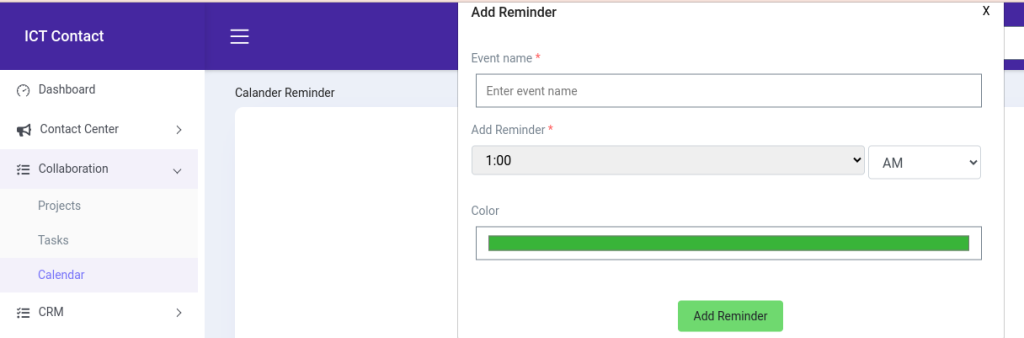 In ICTContact Event Calendar feature is added under Collaboration Feature. The Calendar module in ICTContact allows users to view and manage events in different calendars, both past and scheduled. It also allows users to export events. The module can display company events, workgroups, and personal calendars.