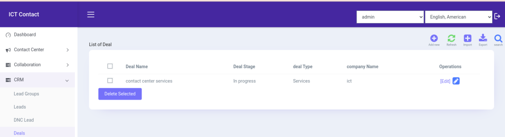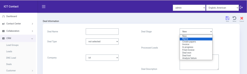 The process of working with deals is called deal or opportunity management. ICTContact features Deals feature in its Built-in CRM funcationality that come with custom deal stages, which will help clients to visualize sales pipeline and to estimate future revenues. ICTContact provided various deal stages for clients such as in progress, new, create papers, deal won, deal lost that will help clients to visualize and finalized their sales and estimates generated revenue.