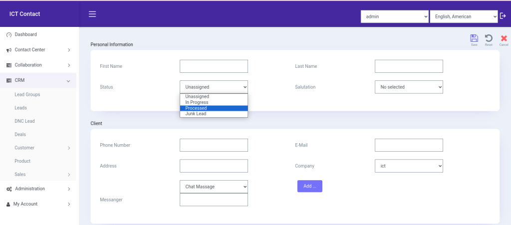 Users can create leads easily with user-friendly interface in ICTContact. User will add required information and also select company under which leads created and then select the lead group. ICTContact allows user to select the status of leads such as in progress, processed and junk leads.