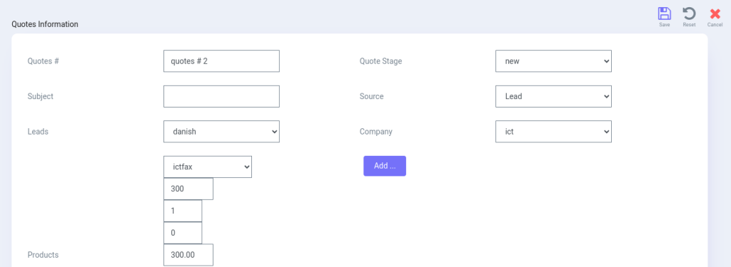 In ICTContact user/admin can create sale quotes. User will select company for which he has to creating quotes. User can also select quotes stages such as completed, in progress, sent to client. User also has to select product for quote.