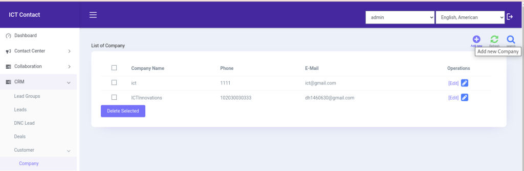 ICTContact also offers company module in its CRM features. In ICTContact company module is also important features that allows client/user to create deal under the company it means user will has to create company first then he will able to add lead under this company. Same like leads, deal also will be offered or create under the company otherwise user/client will not offer deals. With ICTContact company feature clients will keep and create their supplier data under company.
