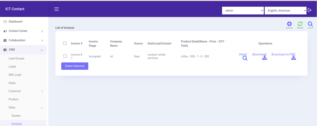 In ICTContact user/client will also able to view invoice, download invoice, and download as pdf. sales invoice feature in ICTContact enhances the efficiency of financial operations by providing a user-friendly interface to create, manage, and track invoices.