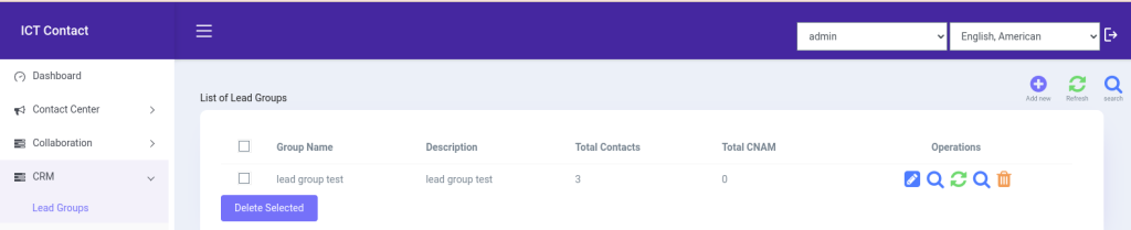 In ICTContact Built-in CRM feature Lead group acts a container for contacts of a particular domain. Campaigns in ICTContact also dials leads from a particular leads group that is selected at the time of campaign creation.