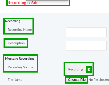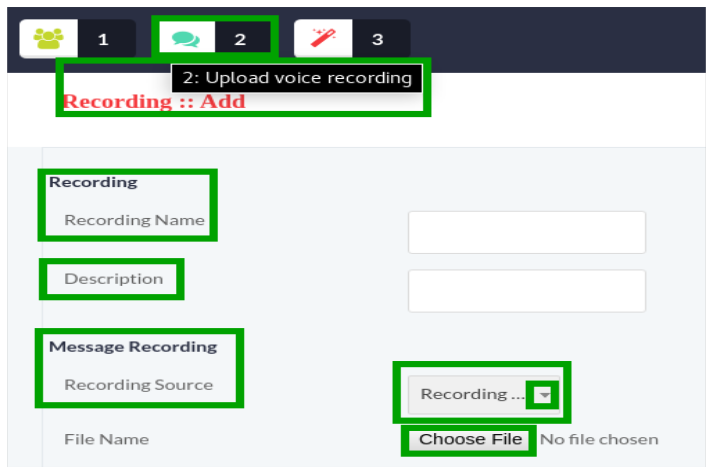 Click on Upload Voice Recording button, a window form will appear on screen that contain required fields, fill the specified fields such as: