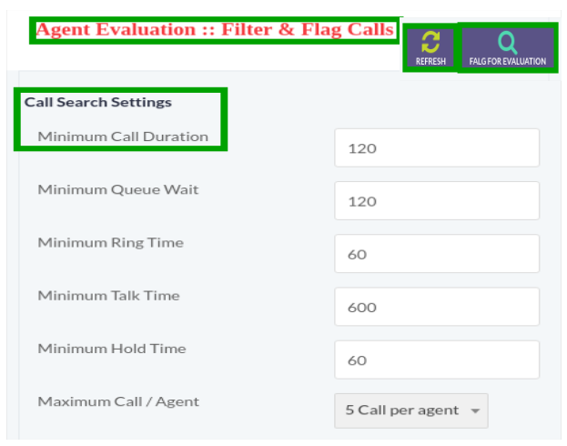 Click on Flag For Evaluation button, a window container will appear on screen that contain required fields, fill the specified fields to search and flag matching calls for evaluation as shown below: