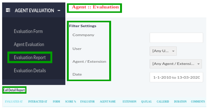 Click on Evaluation Report menu button from menu, a window container will appear on screen that contain following fields to evaluate the performance of the agents according to selected date. Fill the following fields such as: