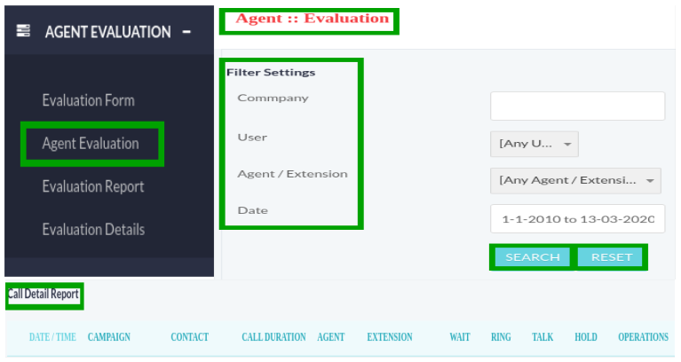Click on Agent Evaluation menu button from main menu, following sub-menus will appear on screen as shown below: