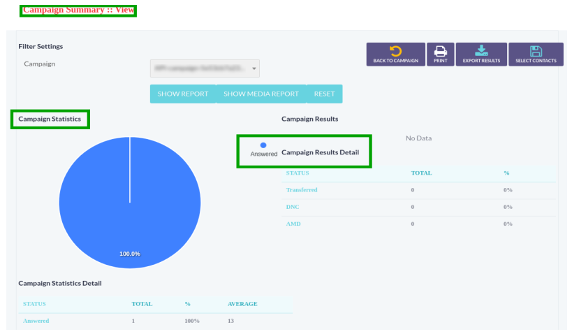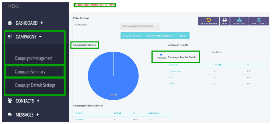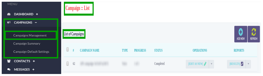 Click on Campaign Management menu, a window container will appear that contains a list of completed campaigns and details as shown below: