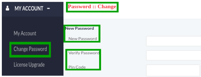 - Click on Change Password menu button to create password, a pop-up form will appear on screen that contain required fields, fill the specified fields such as: