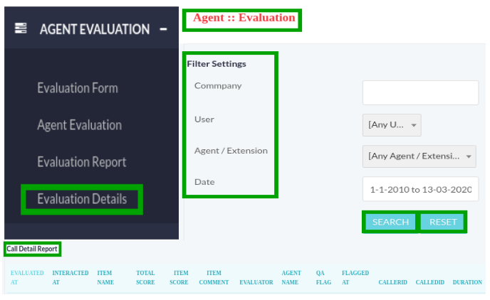 Click on Evaluation Details menu button from menu, a window container will appear on screen that contain following fields to evaluate the performance of the agents according to selected date. Fill the following fields such as: