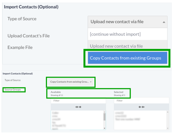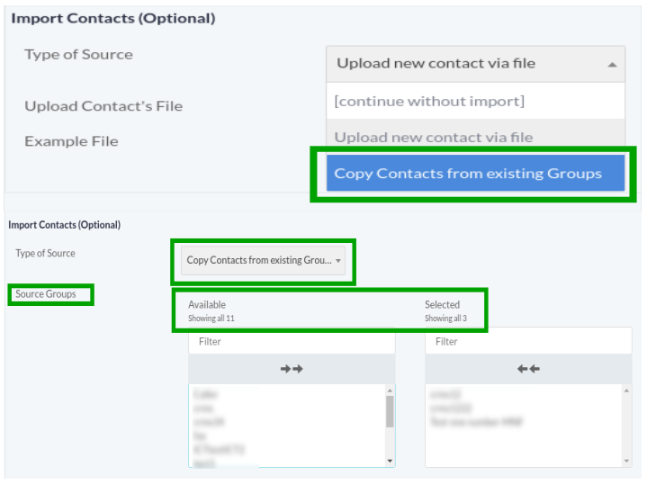 Select Copy Contacts from existing groups option to take existing contacts from groups as shown.