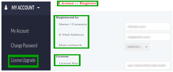 Click on License Upgrade button from menu, a window container will appear on screen that contain following fields, fill the specified fields to for license registration that are as follows: